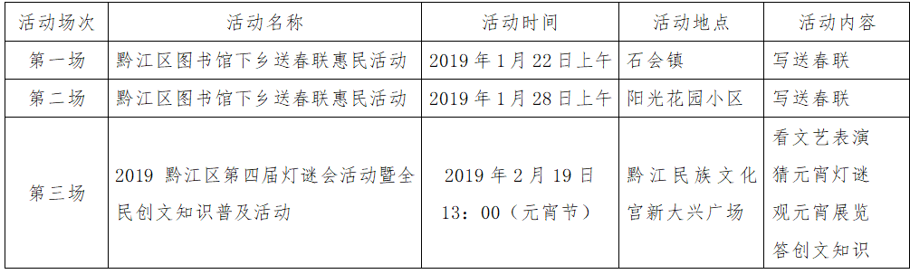 昨夕犬年歡歌迎大地;今朝豬歲新景滿神州。為了讓廣大市民歡歡喜喜過大年,在2019年新春佳節之際,黔江區圖書館將舉辦免費寫送春聯,看春節文藝表演,猜元宵燈謎等系列惠民活動,送祝福,與市民共賀新春。祝大家在新的一年里:身體健康平安,生活充實飽滿,事業步步高升,財運滾滾而來,家庭美滿幸福!